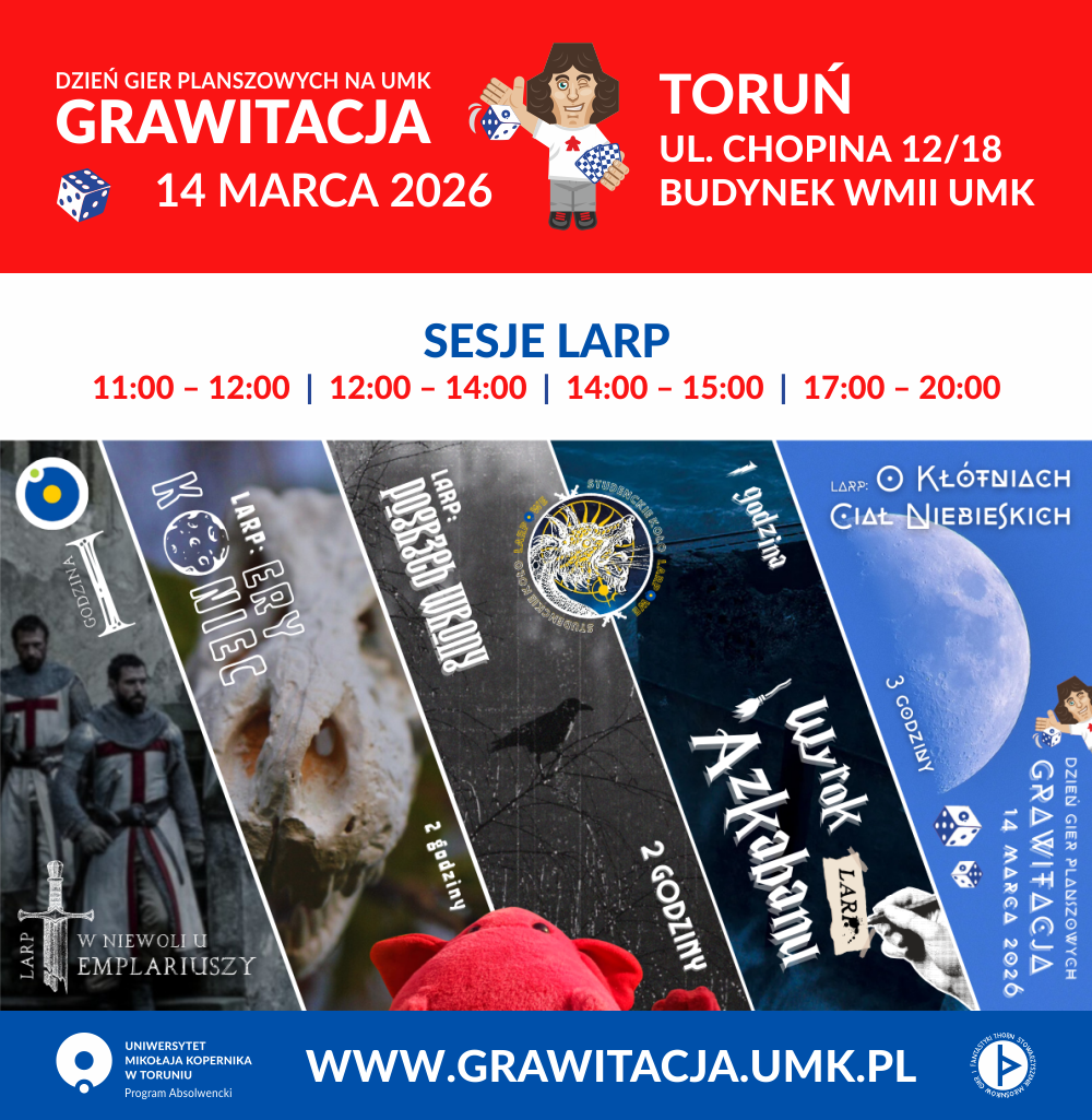 Mistrzowie i Mistrzynie Gry z Koła Larpowego UMK (Maciej “Red” Fryckowski i Dagmara “Żaba” Maciejewska) wprowadzą uczestników w świat gier fabularnych typu LARP (live action role–playing). Zachęcamy do udziału osoby, które nigdy nie grały w gry fabularne i chcą poznać coś nowego.